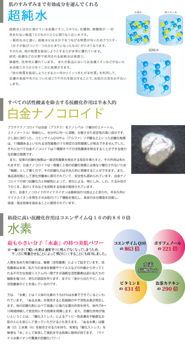 水素ボールを配合しています。白金や金、銀などの抗酸化力の優れた成分を構造水という特殊な水に入れる事で、ナノレベルより小さいピコレベルでの浸透力で、お肌に有効成分を届けます。